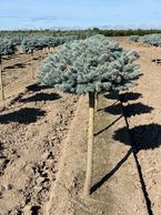Zone 3-8. Grows to approximately 6’ x 4’ over 10 years. Weeping tree with blue-green needles. Staked for height.